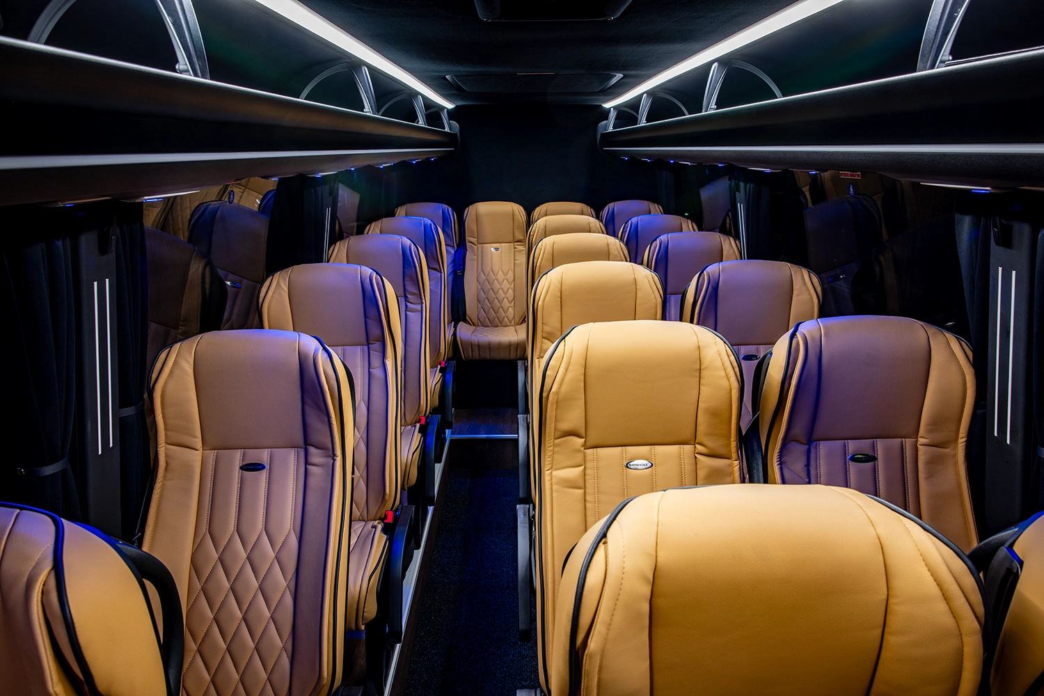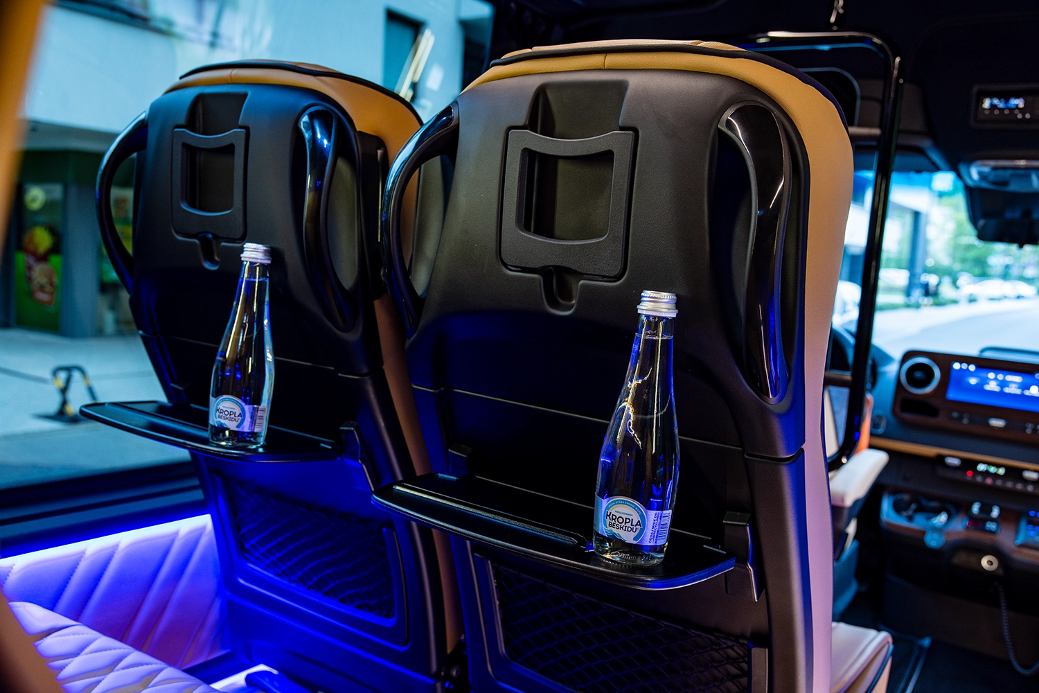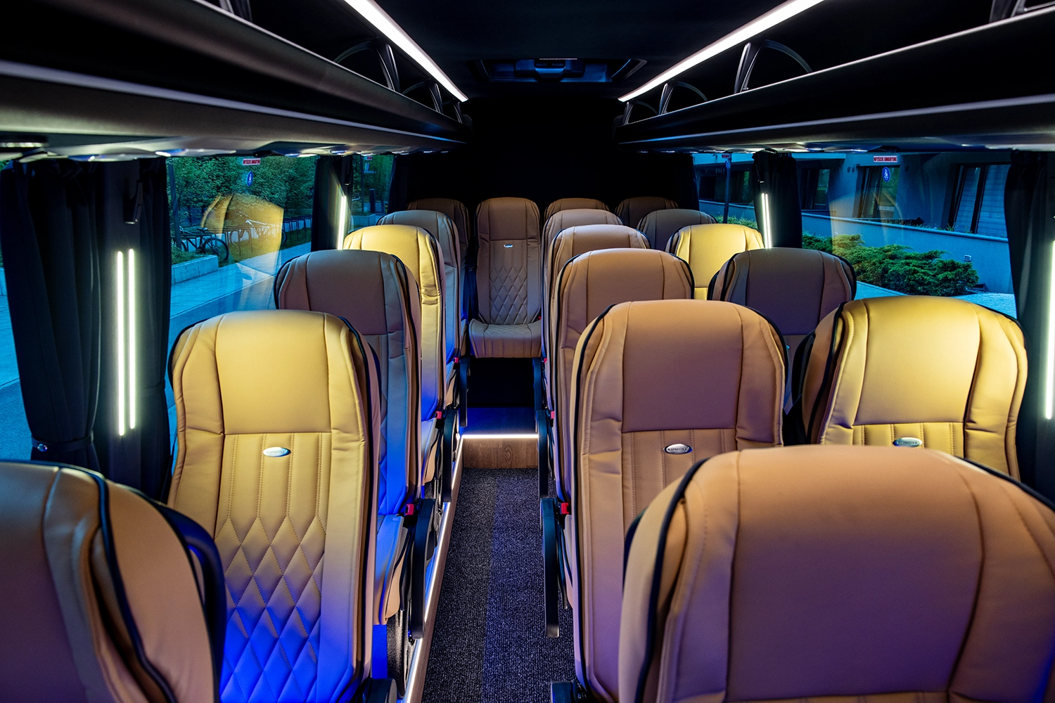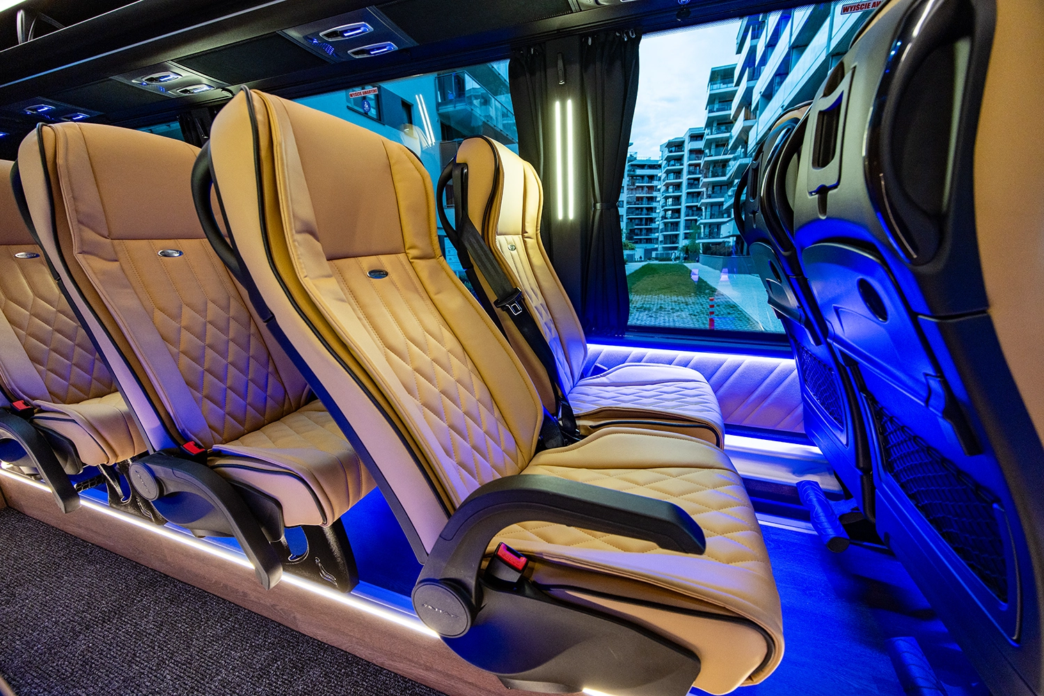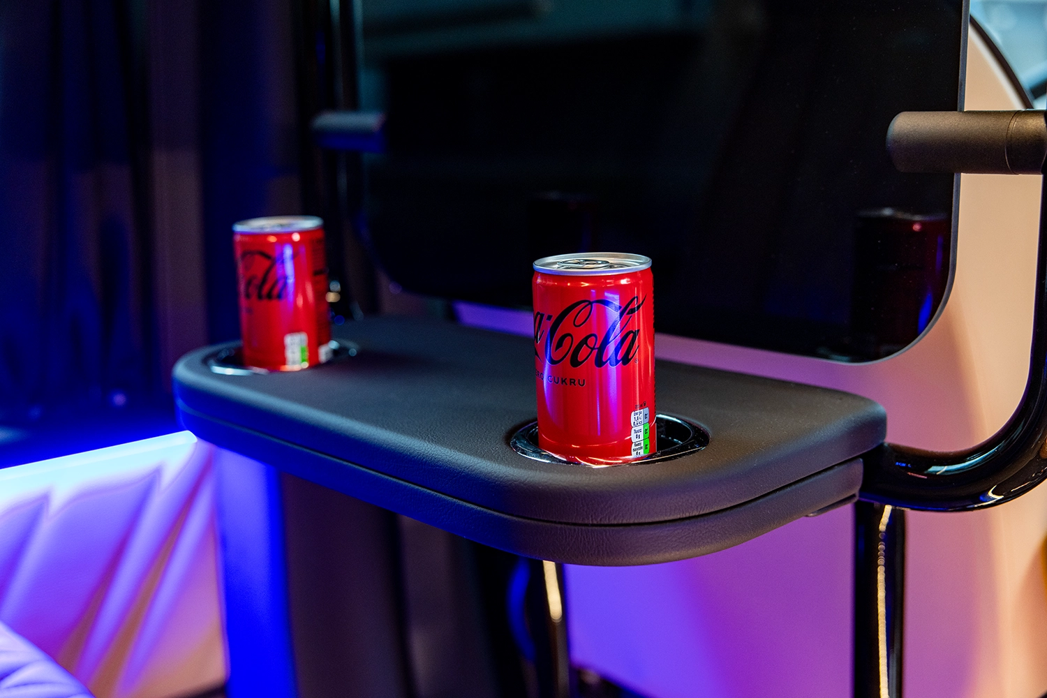 Pojazd został zaprojektowany tak, by zapewnić wygodę wszystkim pasażerom. Fotele mają ręczną regulację oparcia, wygodne podnóżki oraz składane stoliki z miejscami na napoje, co ułatwia pracę lub odpoczynek w czasie jazdy.