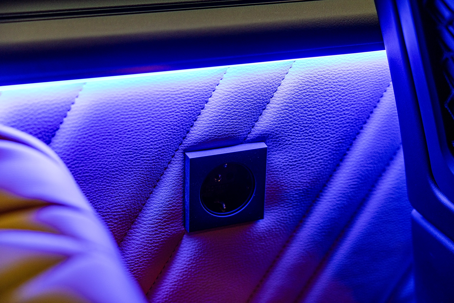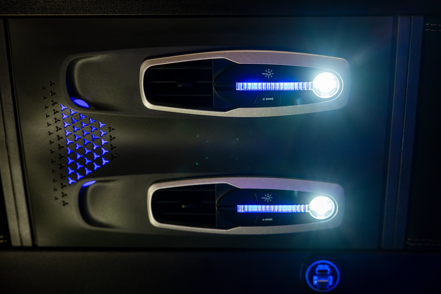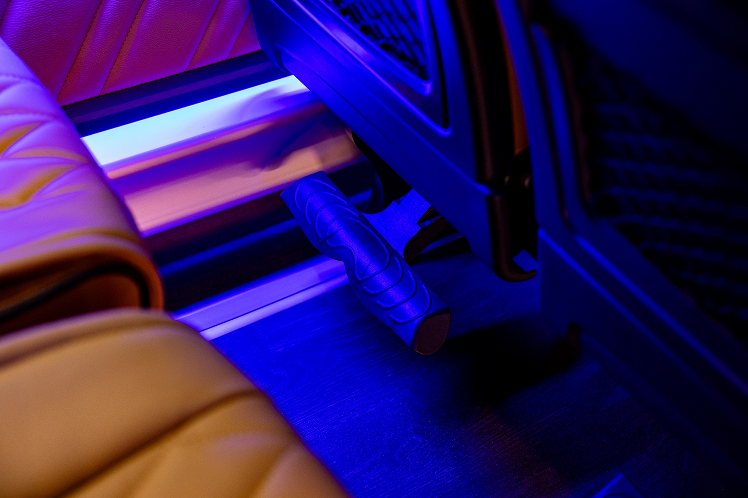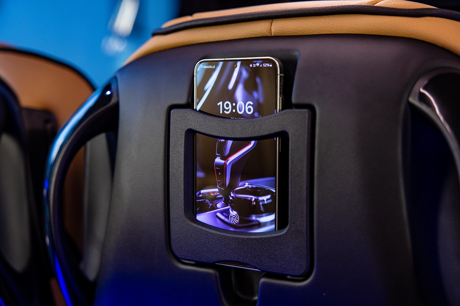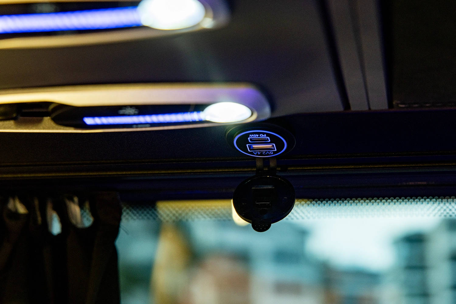 W oparcia foteli wbudowano uchwyty na telefon, a nad każdym fotelem znajdują się porty USB typu A i C oraz indywidualne oświetlenie, dzięki czemu każdy pasażer ma łatwy dostęp do ładowania urządzeń i światła do czytania.